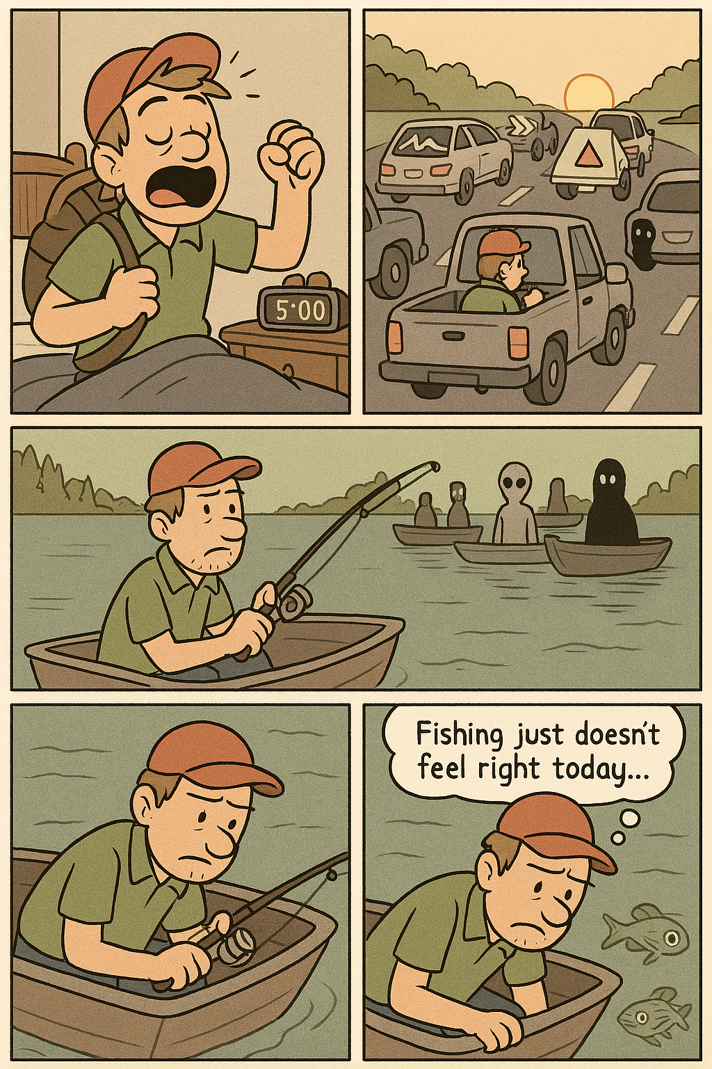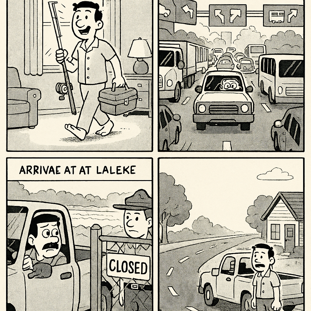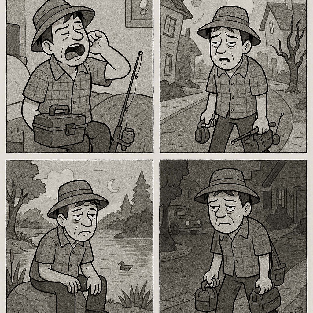 He woke up already smiling, already zipped, already packed. Today—finally—he was going fishing. No errands, no detours, no cosmic interference. Just a man, a lake, and the promise of silence.