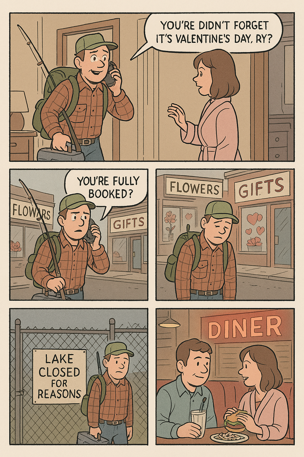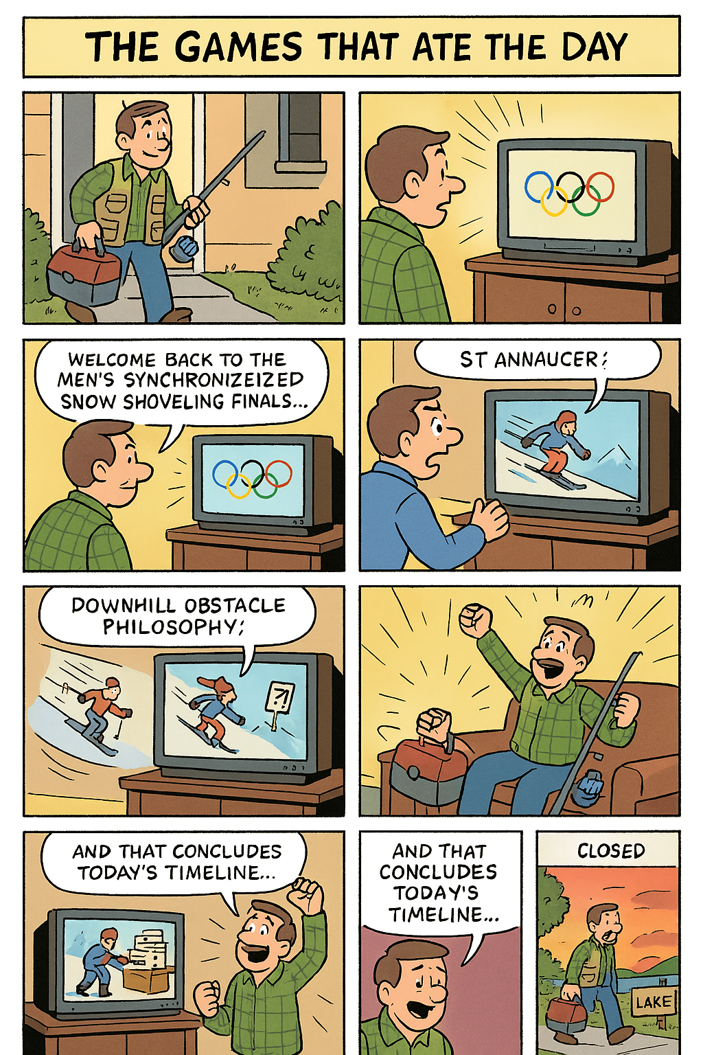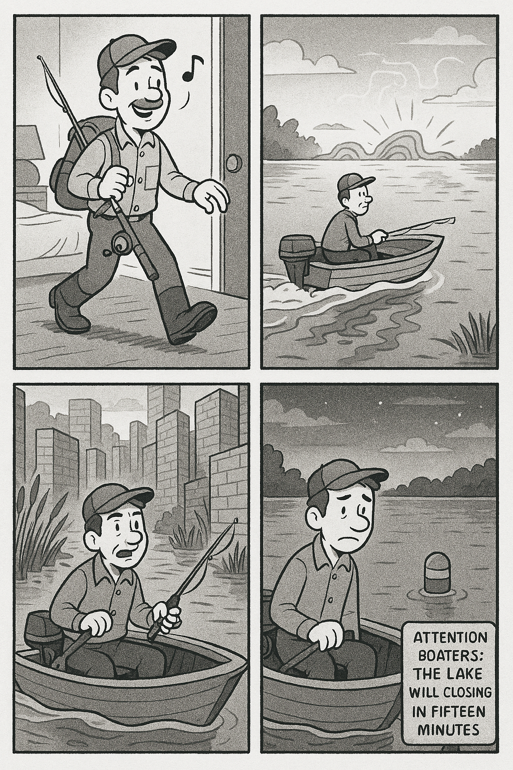He woke up already smiling, already zipped, already packed. Today—finally—he was going fishing. No errands, no detours, no cosmic interference. Just a man, a lake, and the promise of silence.