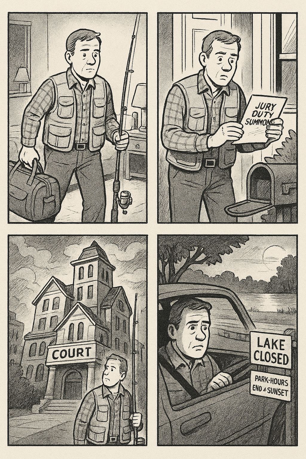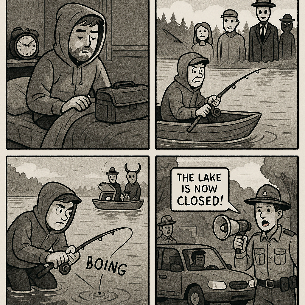 He cast his line anyway. Nothing. Not even a nibble. The whole lake felt wrong—like fishing on a Sunday afternoon was a violation of some cosmic scheduling rule.