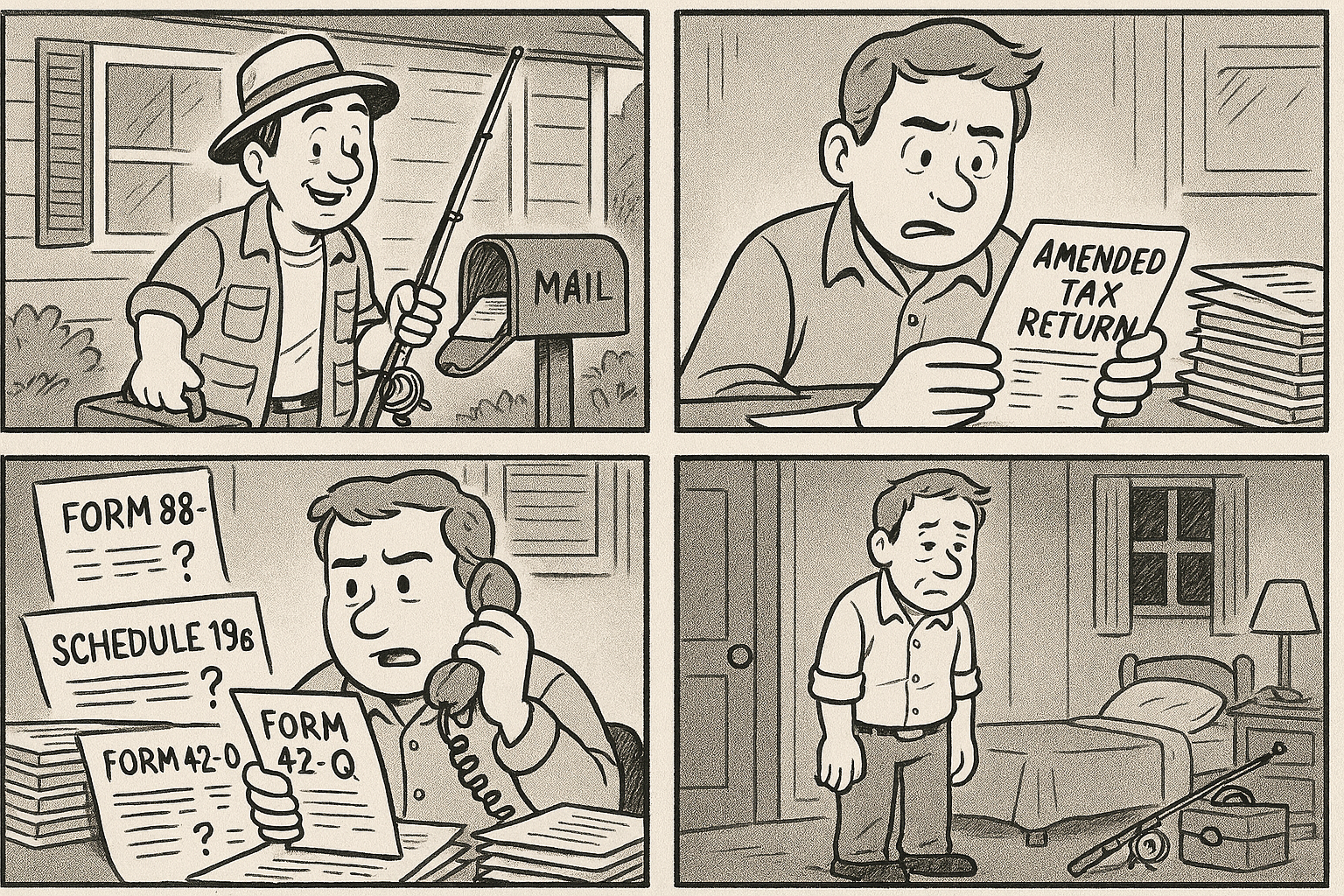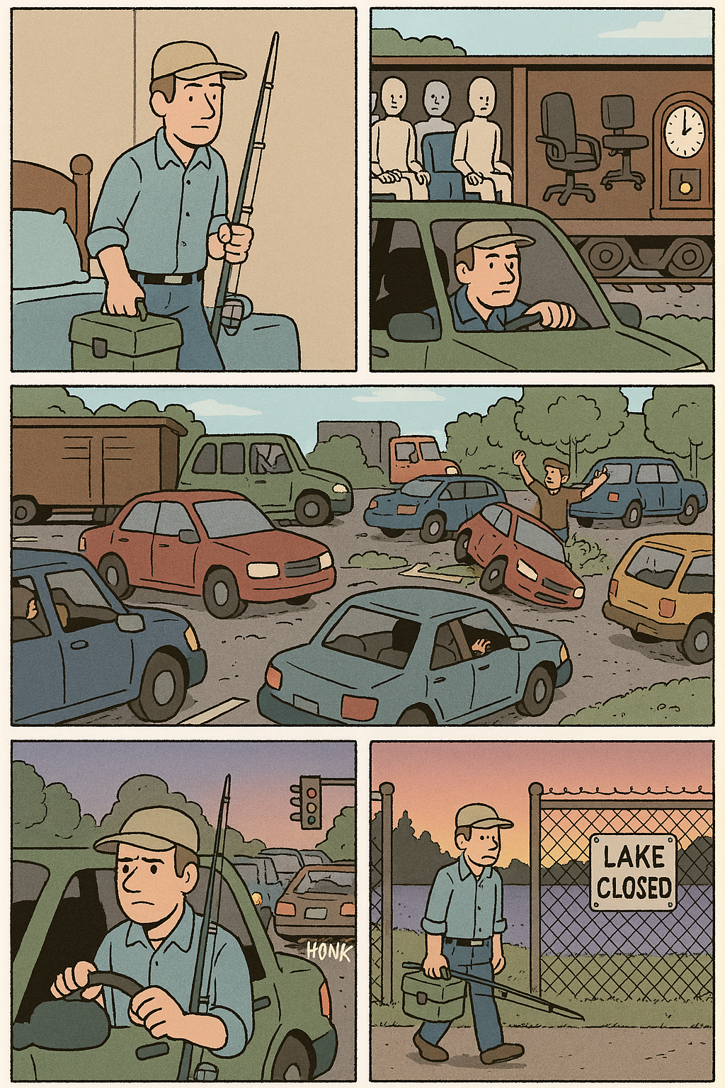 By now he was exhausted, bewildered, and still clutching his fishing rod like a security blanket. He drove to the lake anyway, hoping the universe might give him one small mercy.