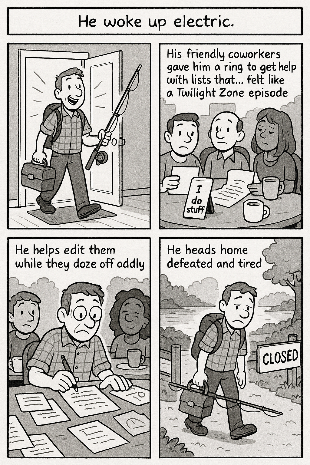 He woke before dawn, humming with weekend freedom, tacklebox clicking at his side like a loyal dog. The lake was calling—finally, a Saturday with no obligations, no errands, no cosmic interference. He tiptoed through the house, boots laced, thermos filled, the scent of early morning possibility clinging to him like dew.