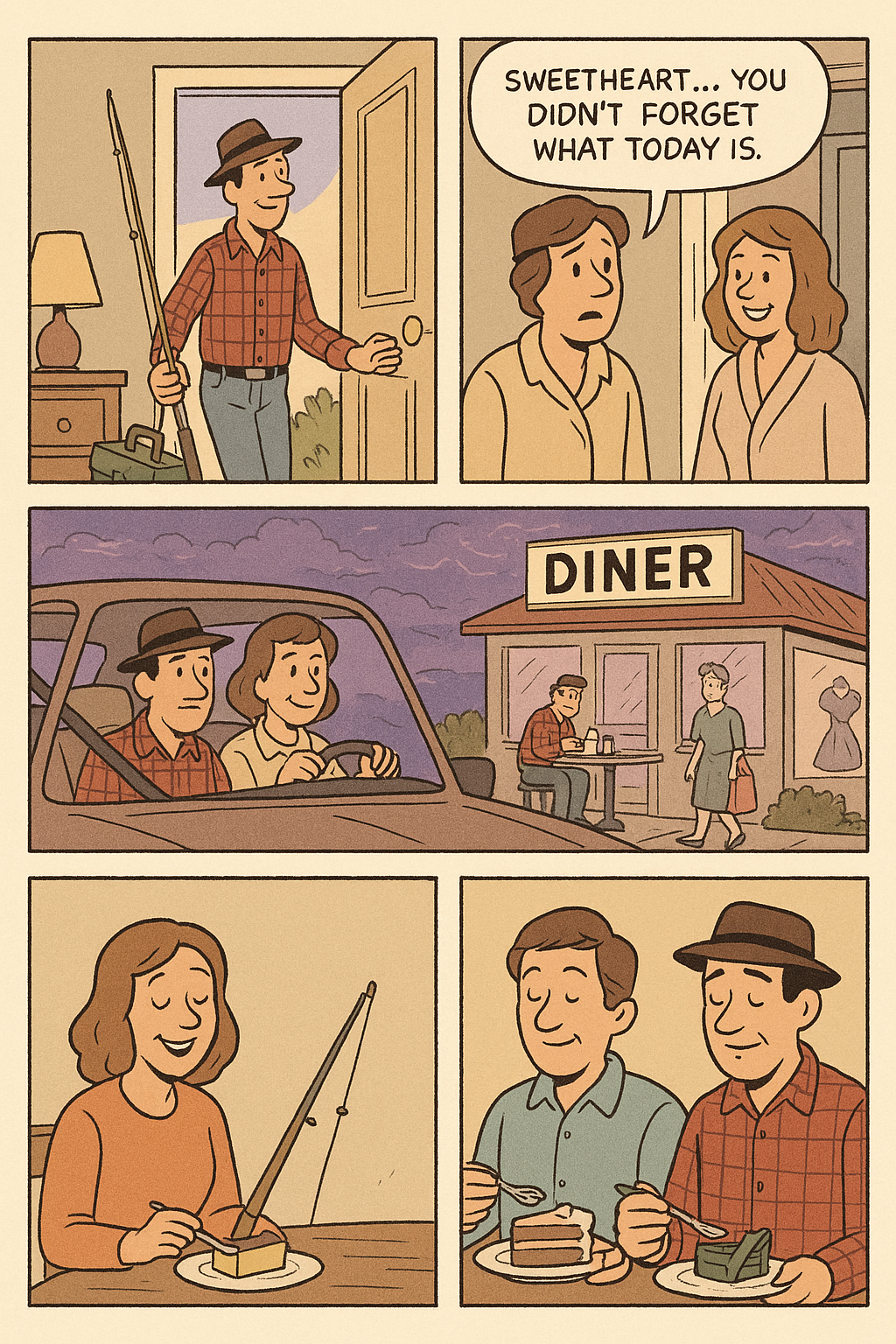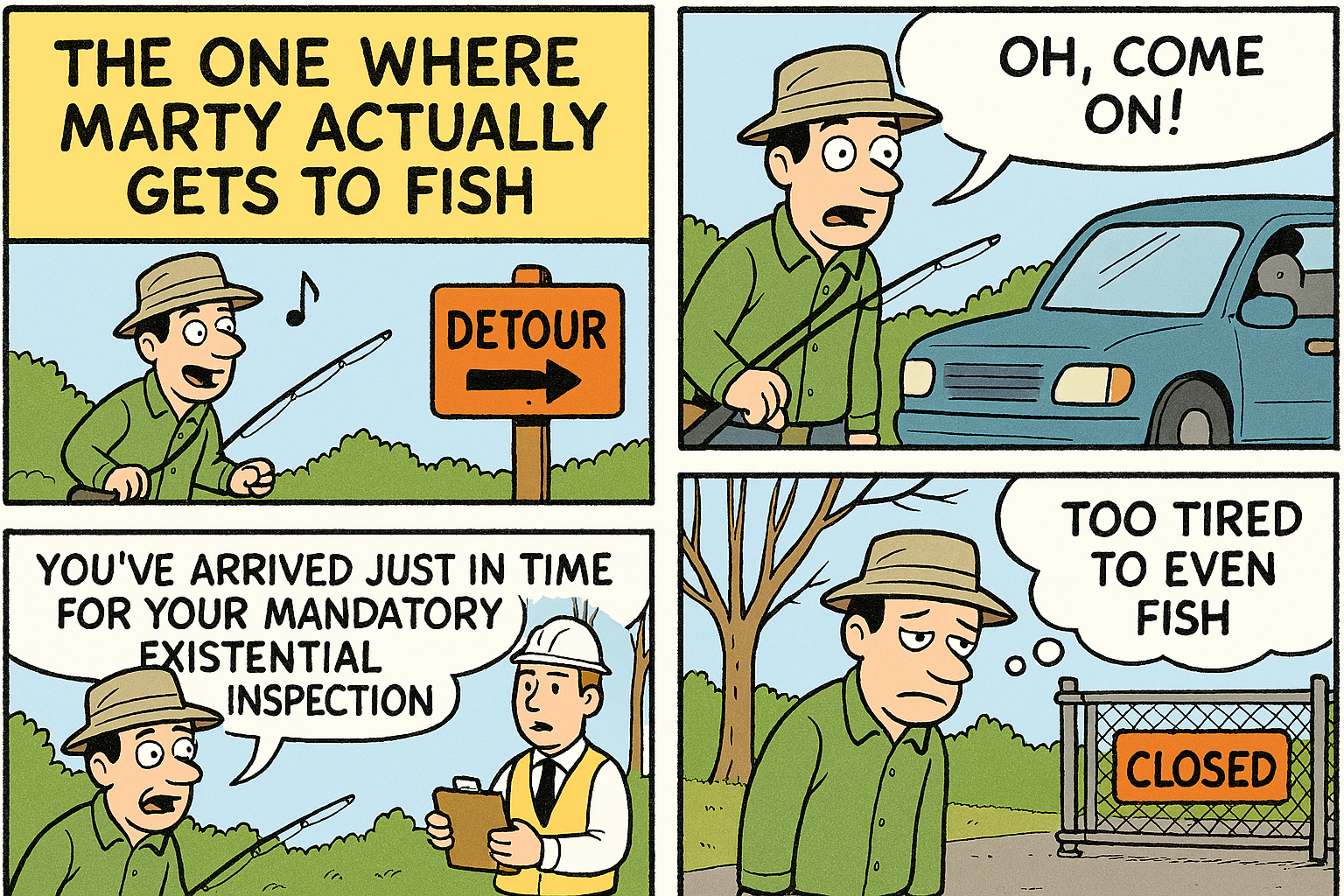 The morning had that canned‑laughter glow to it—the kind of sunshine that practically winked at you. Marty took it as a sign. Today, finally, he would go fishing. No errands, no chores, no “quick favors.” Just him, his tackle box, and the quiet lake waiting like a promise.