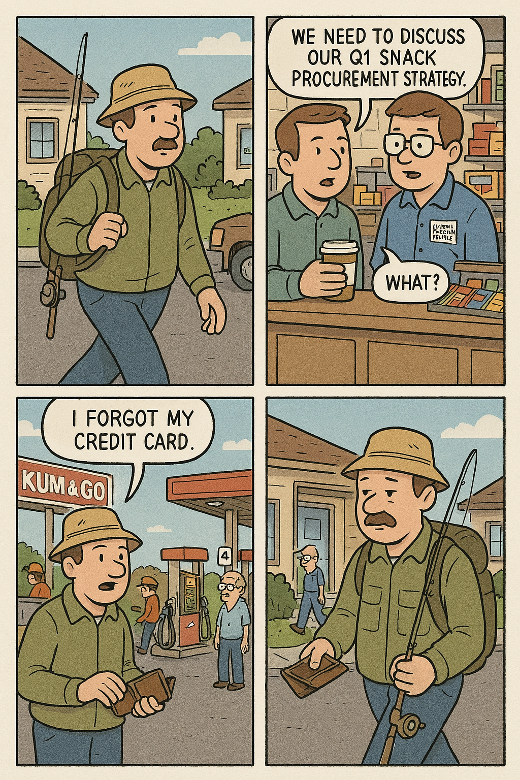 “Of course,” the cashier said, nodding gravely. “But first, we need to discuss our Q1 snack procurement strategy.”