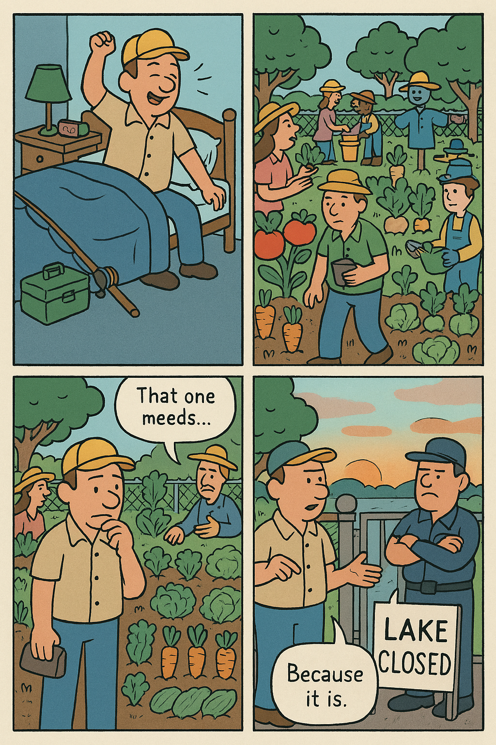 Gary woke up with the kind of optimism usually reserved for sitcom dads on season premieres. His tackle box was packed, his thermos was full, and his smile was the smug grin of a man who believed—truly believed—that today he would fish.